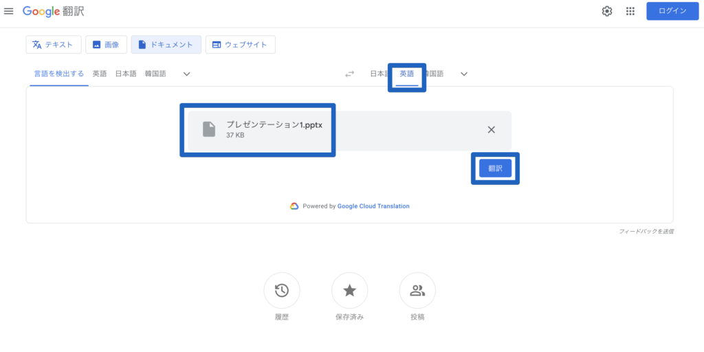 翻訳するドキュメントが選択されていることを確認。翻訳先の言語を選択し「翻訳」を押下。
