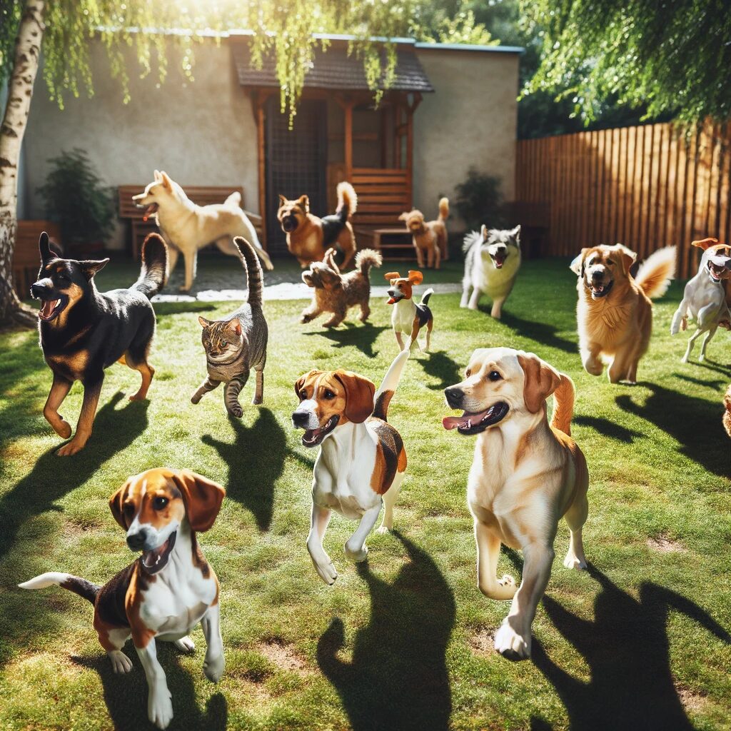 プロンプト「Generate images of dogs playing in the yard.(庭で遊ぶ犬の画像を生成してください)」