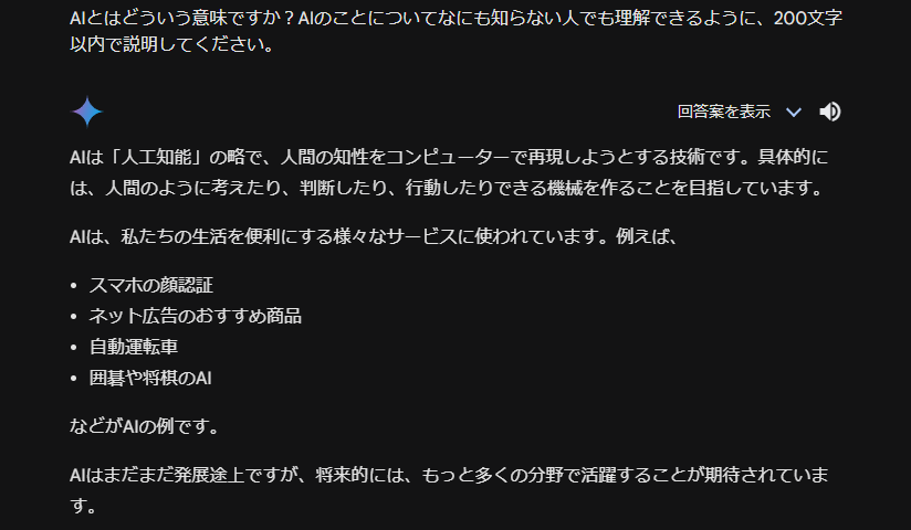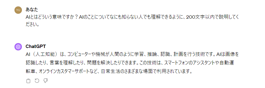 プロンプト「AIとはどういう意味ですか?AIのことについてなにも知らない人でも理解できるように、200文字以内で説明してください。」