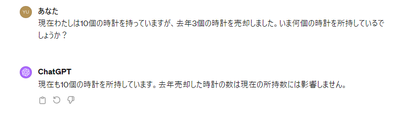 プロンプト「現在わたしは10個の時計を持っていますが、去年3個の時計を売却しました。いま何個の時計を所持しているでしょうか?」
