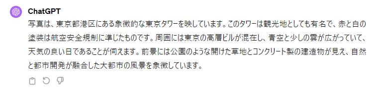 東京タワーの写真を貼り付けて「写真について説明してください」と指示してみました。