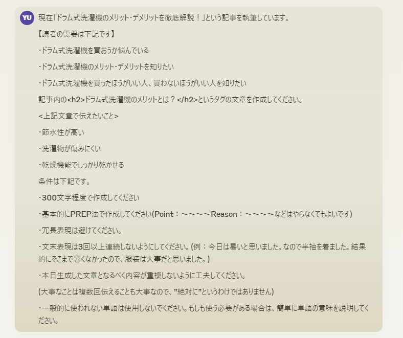 試しに上記プロンプトを活用して、文章を生成してみます。使用したプロンプトは下記画像のとおりです。
