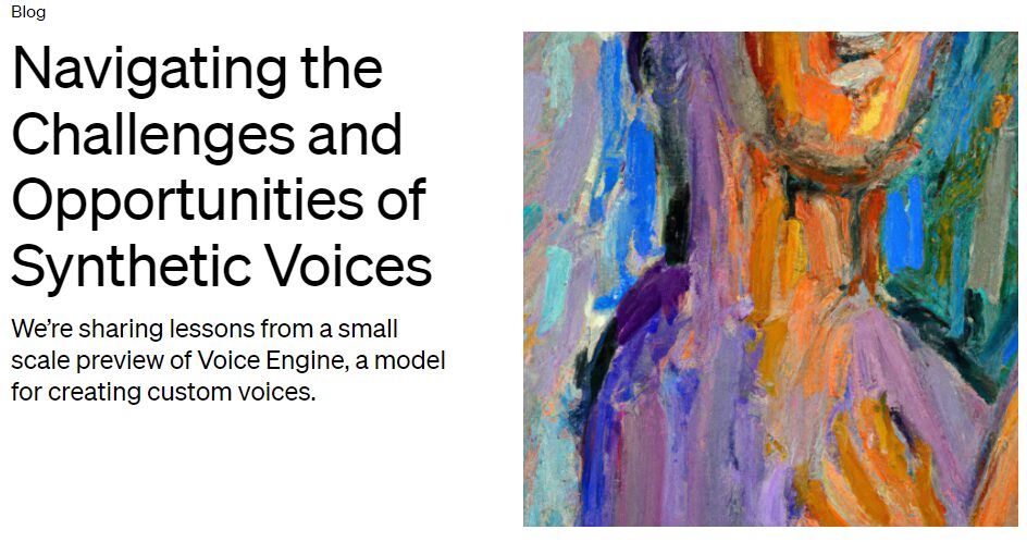 OpenAI社は2024年3月、人間のリアルな声を生成できる音声生成AIモデル「Voice Engine」を発表。悪用の可能性などを鑑みて、リリースに慎重な姿勢を見せていますが、現時点でのプレビュー結果や知見を公表しました。